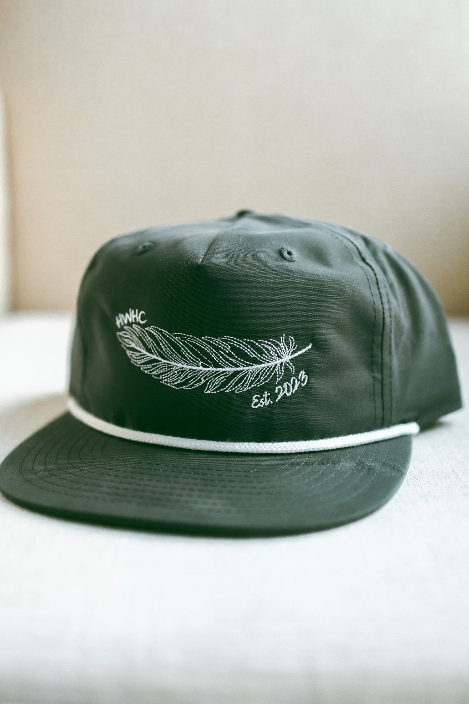 The Lone Feather captures the heart of the outdoors calm mornings, quiet wind, and the simplicity of a life lived outside. With a clean dark-green body and white embroidered feather, this cap carries that timeless look that pairs just as well with work boots as it does with waders. A white rope accent across the brim gives it a vintage edge, while the HWHC and Est. 2023 stitching mark it as a true piece of the High Water heritage. Built with a relaxed fit and lightweight feel, it’s made for those who move slow, think steady, and keep it real.