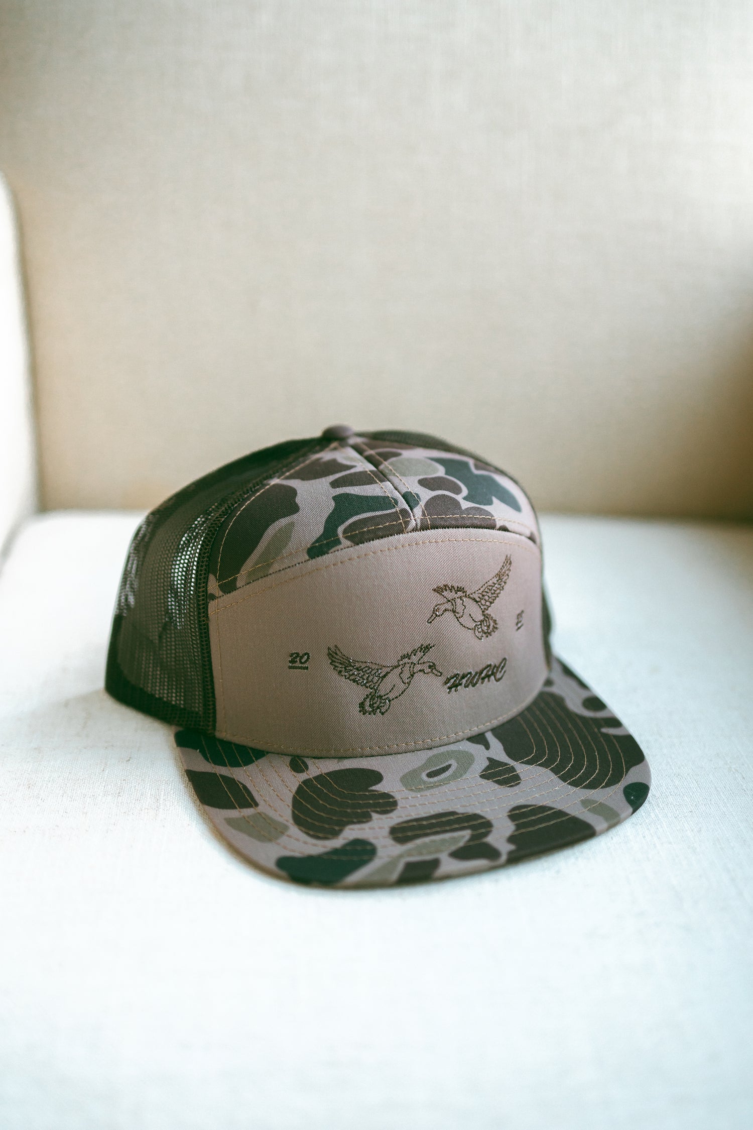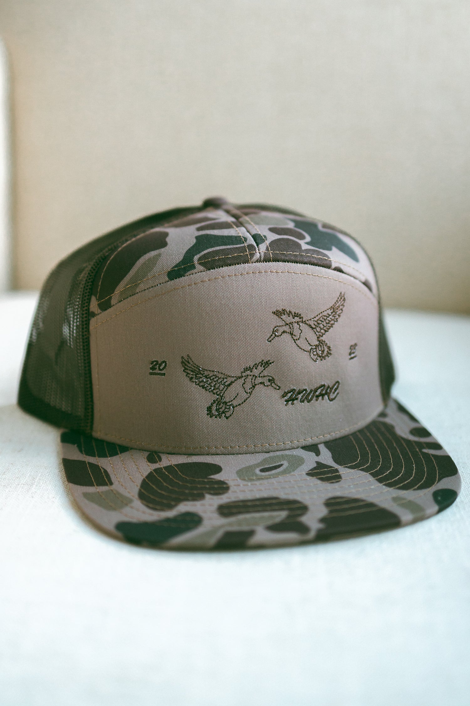Built for those who know the thrill of the hunt and the beauty of the flight. Featuring two embroidered ducks in motion and the HWHC logo, this cap captures the spirit of early mornings, muddy boots, and skies full of wings. Its brown and green camo pattern blends rugged outdoor energy with a clean, everyday look. Designed with a breathable mesh back and adjustable snap closure, this hat is as ready for the blind as it is for the backroads.