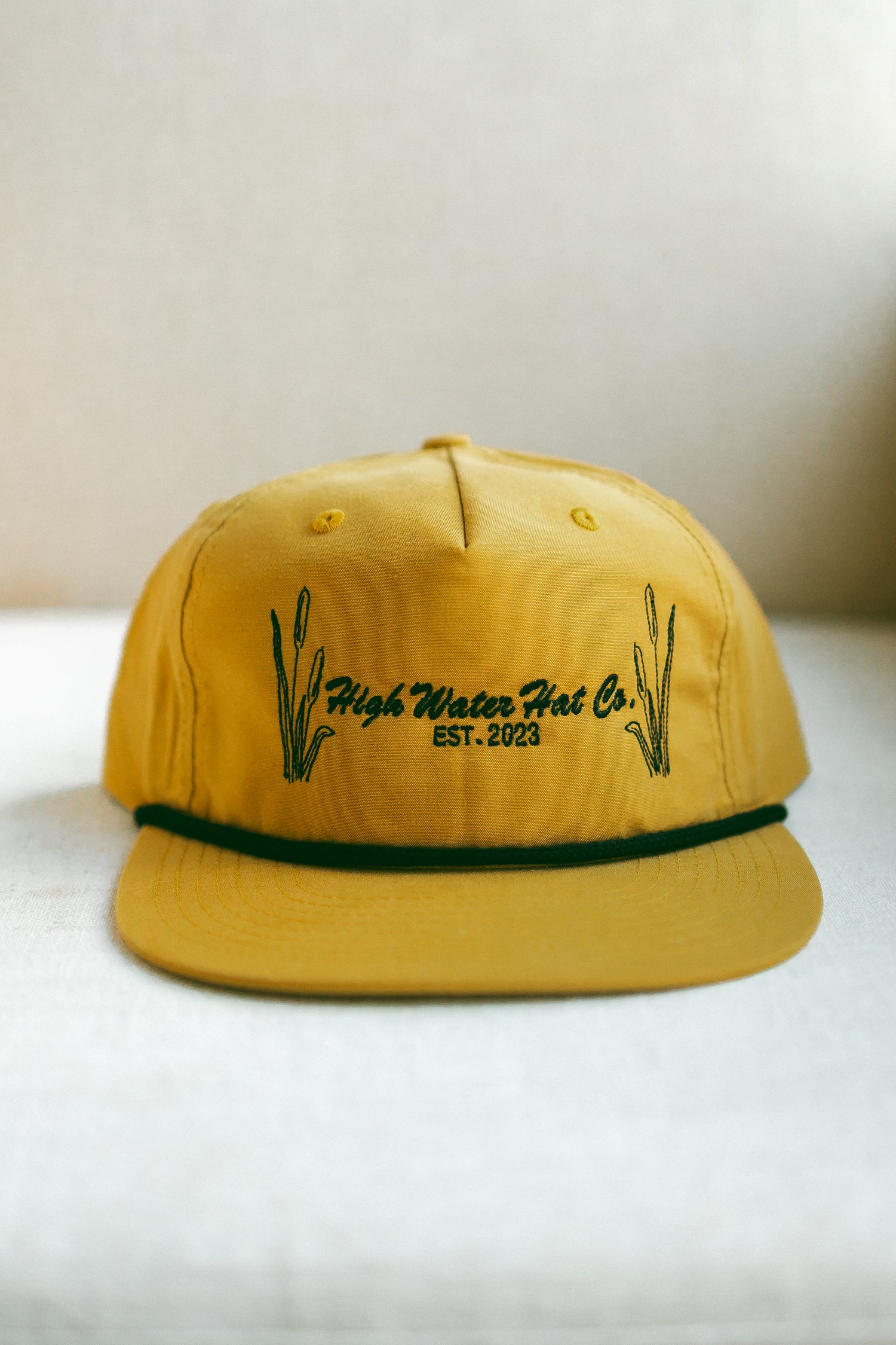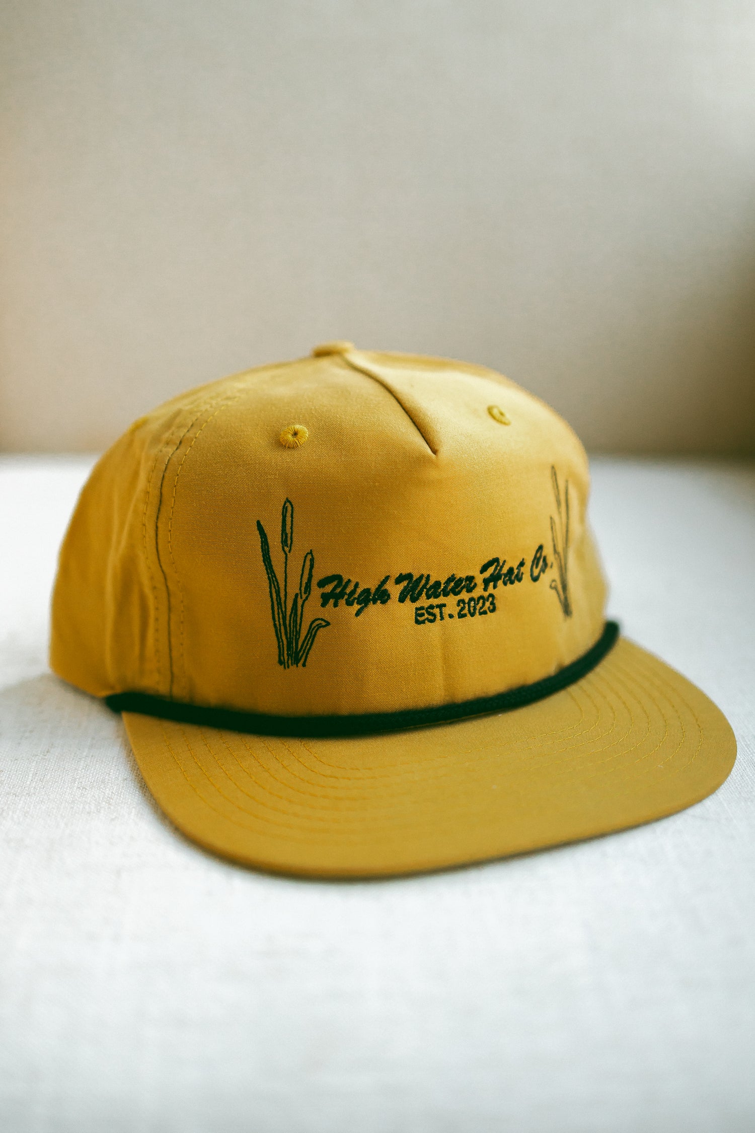 Built for those golden evenings spent near the water. The mustard yellow canvas paired with deep green embroidery captures the essence of cattails at sunset rugged, calm, and unmistakably High Water. With High Water Hat Co. and Est. 2023 stitched proudly across the front, this cap embodies where hard work meets heritage.