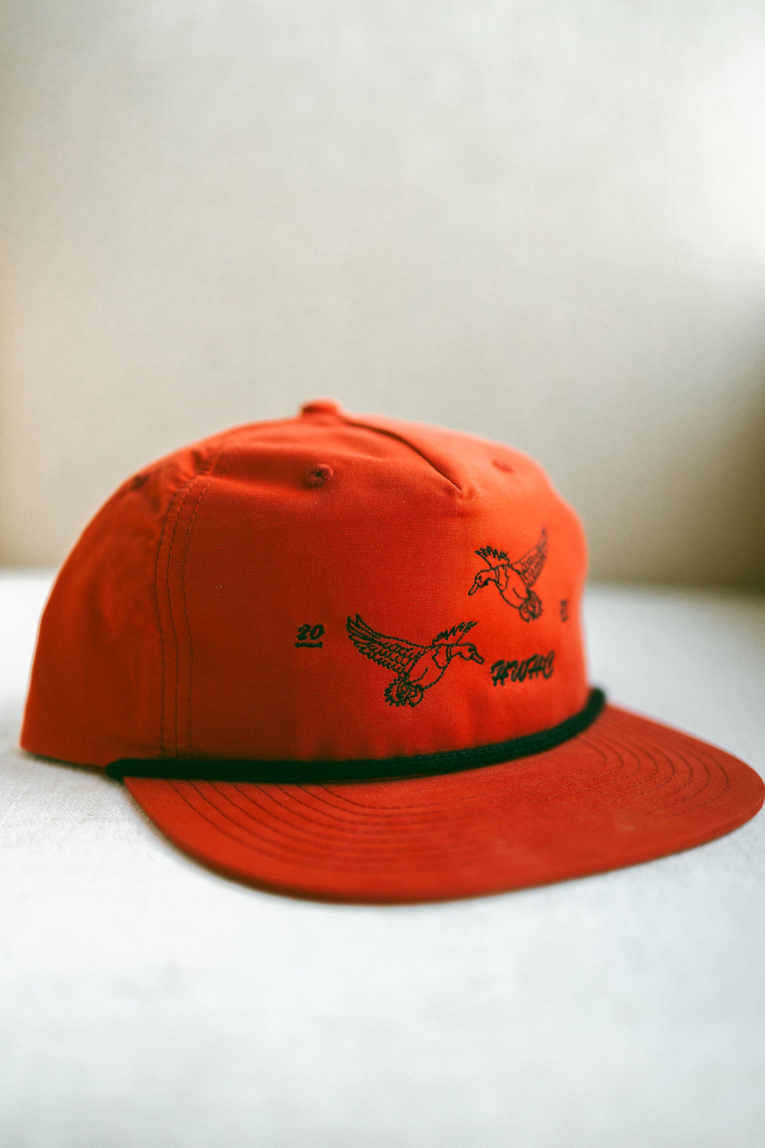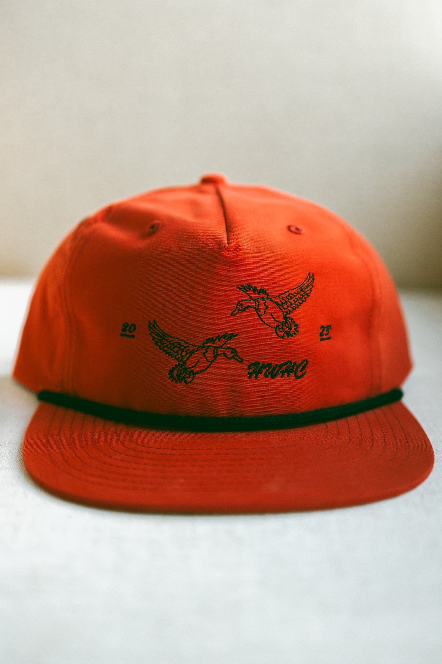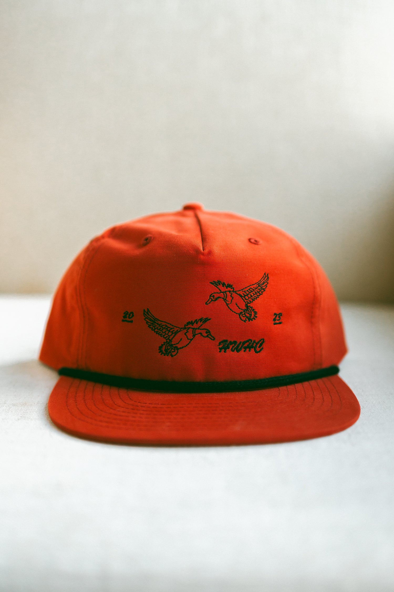 A High Water Hat Co. original built for those early mornings in the blind and late evenings in the woods. The vibrant blaze orange body isn’t just bold it’s functional, made to keep you visible and safe during hunting season. Featuring detailed black embroidery of two ducks mid-flight and the signature HWHC logo, this hat blends timeless hunting heritage with everyday wearability.