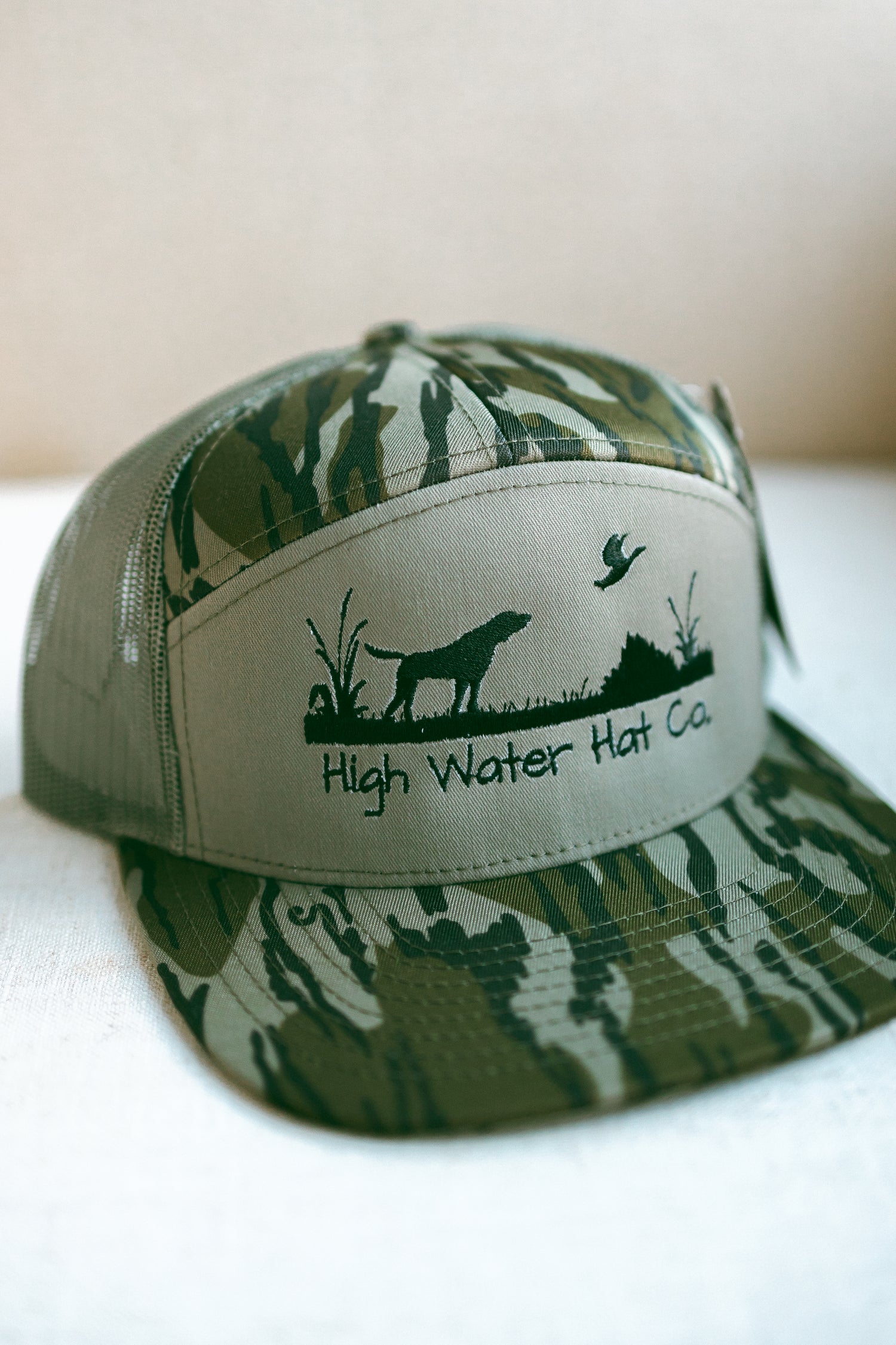 A tribute to man’s best hunting partner, The Retriever captures the heart of the outdoors. Featuring a sleek embroidered design of a bird dog locked on a duck in flight, this hat is made for those who know the value of patience, precision, and loyalty in the field. With a green camo pattern and breathable mesh back, it’s built for early mornings in the marsh, long hunts, and everything in between.