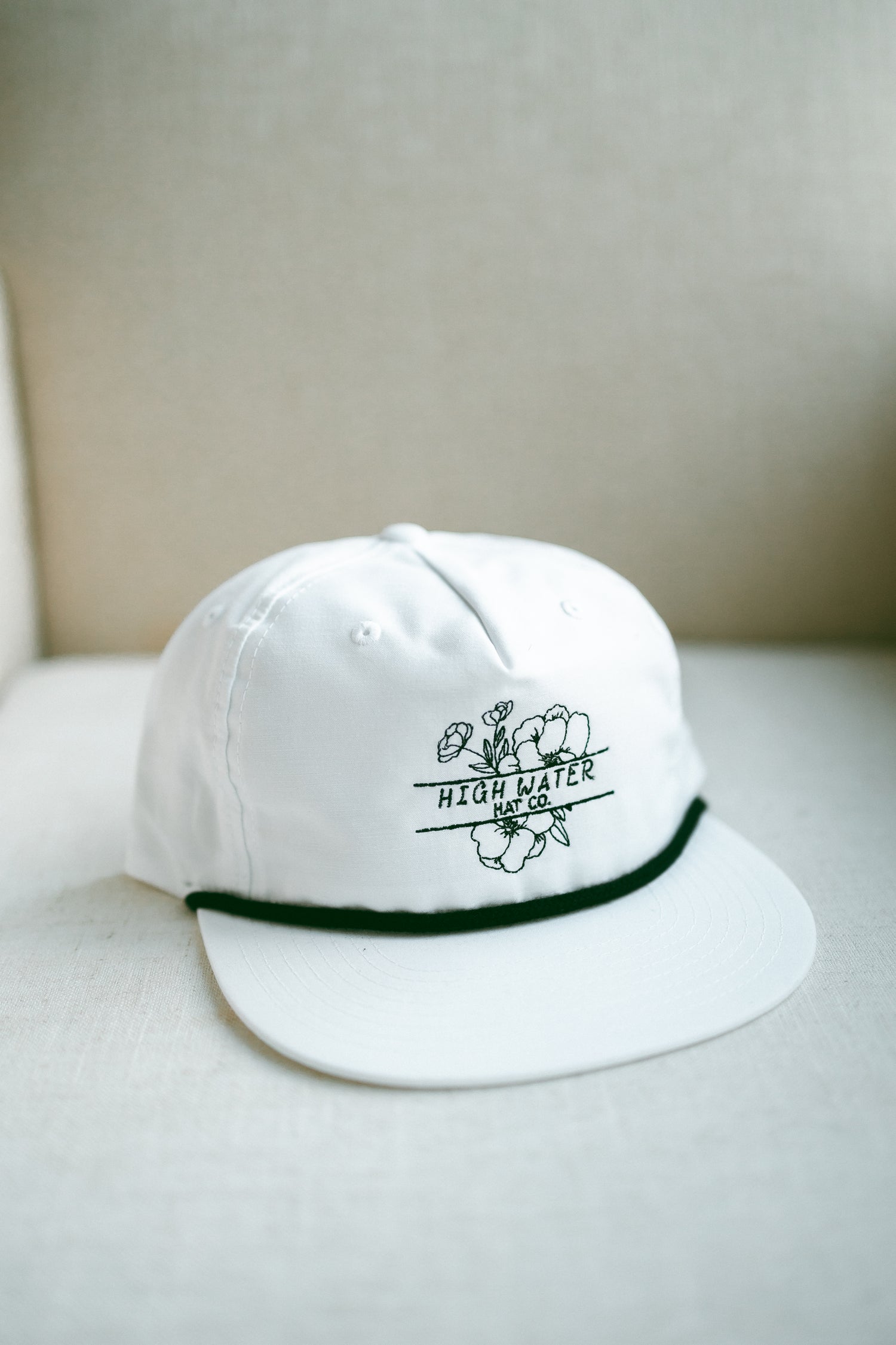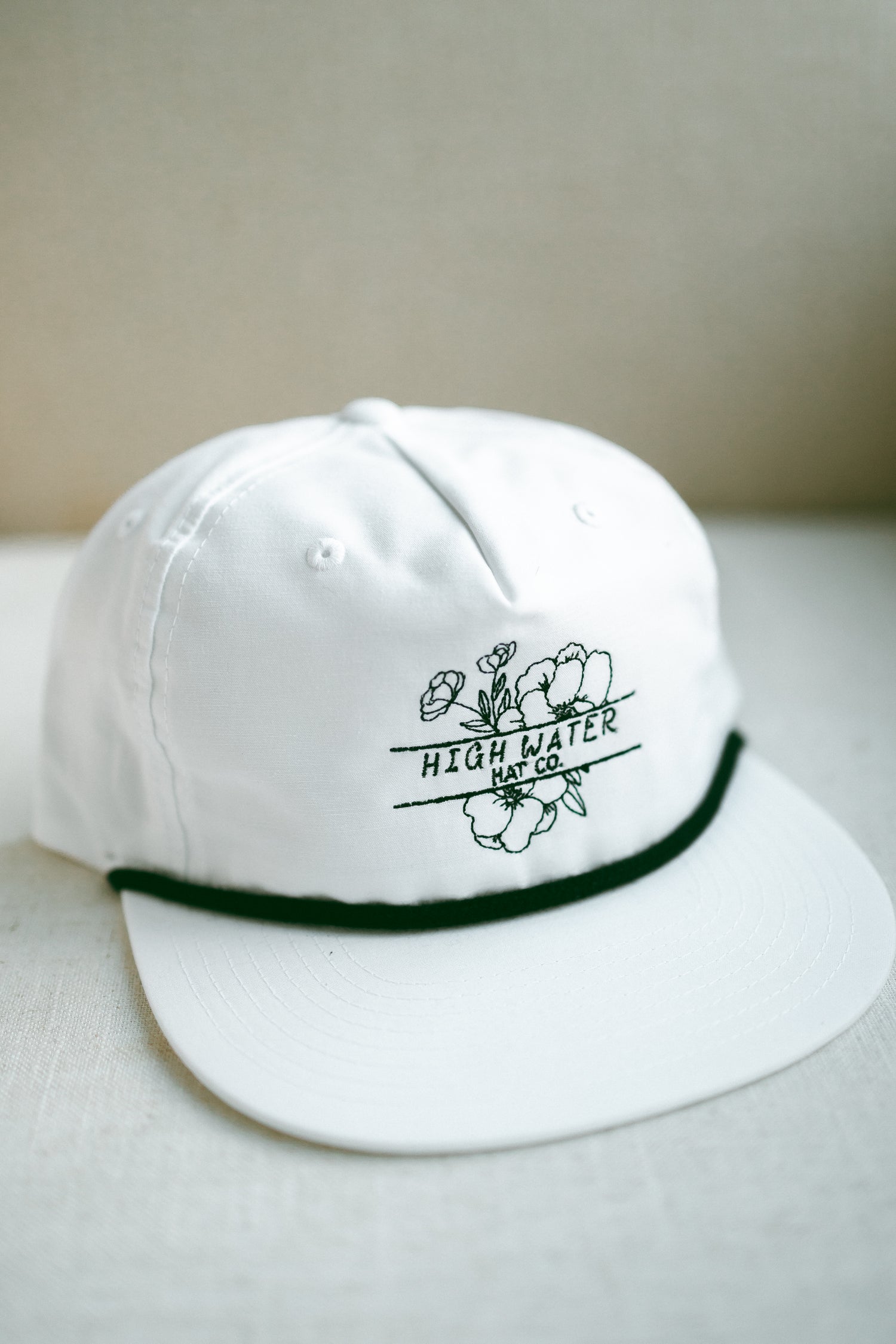 Simple, timeless, and full of southern charm The Southern Bloom brings a softer side to the High Water lineup. The crisp white crown and brim give it a clean, classic look, while the deep green rope and floral embroidery tie it back to the outdoors we love.