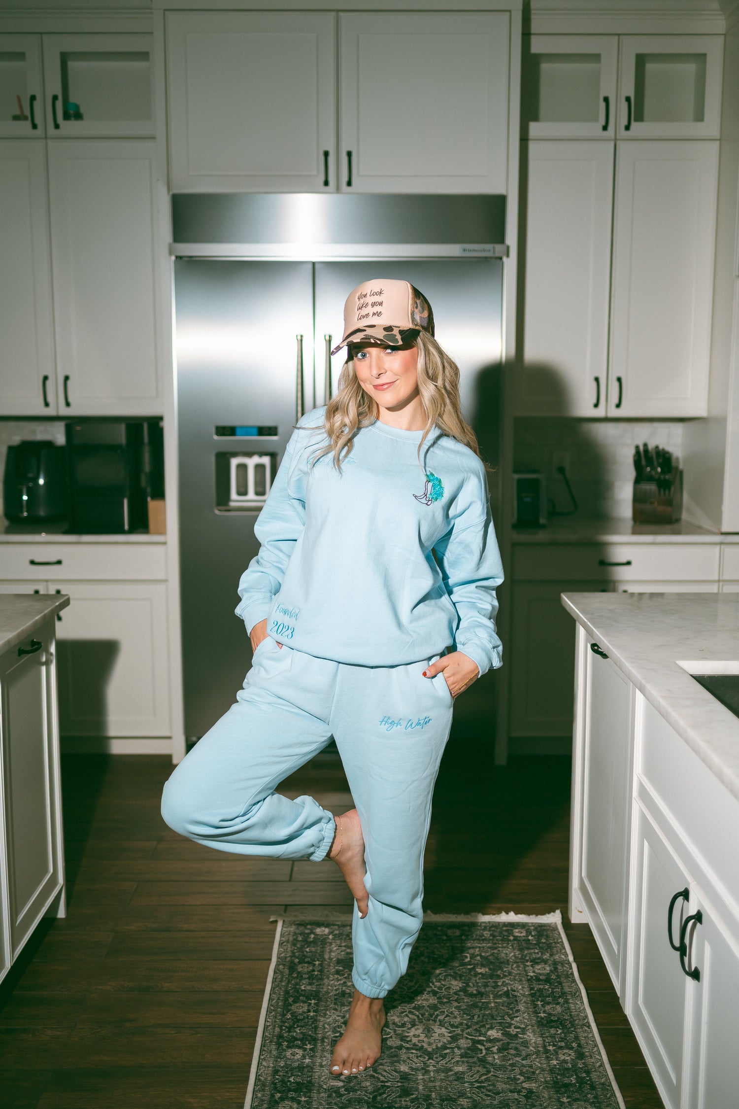 This light blue crewneck is soft, cozy, and full of charm. It features an embroidered cowboy boot wrapped in a turquoise wreath on the front and “Founded 2023” stitched near the hem for a subtle branded touch. Perfect for lounging or casual days out, it gives off easygoing southern vibes with a stylish twist.